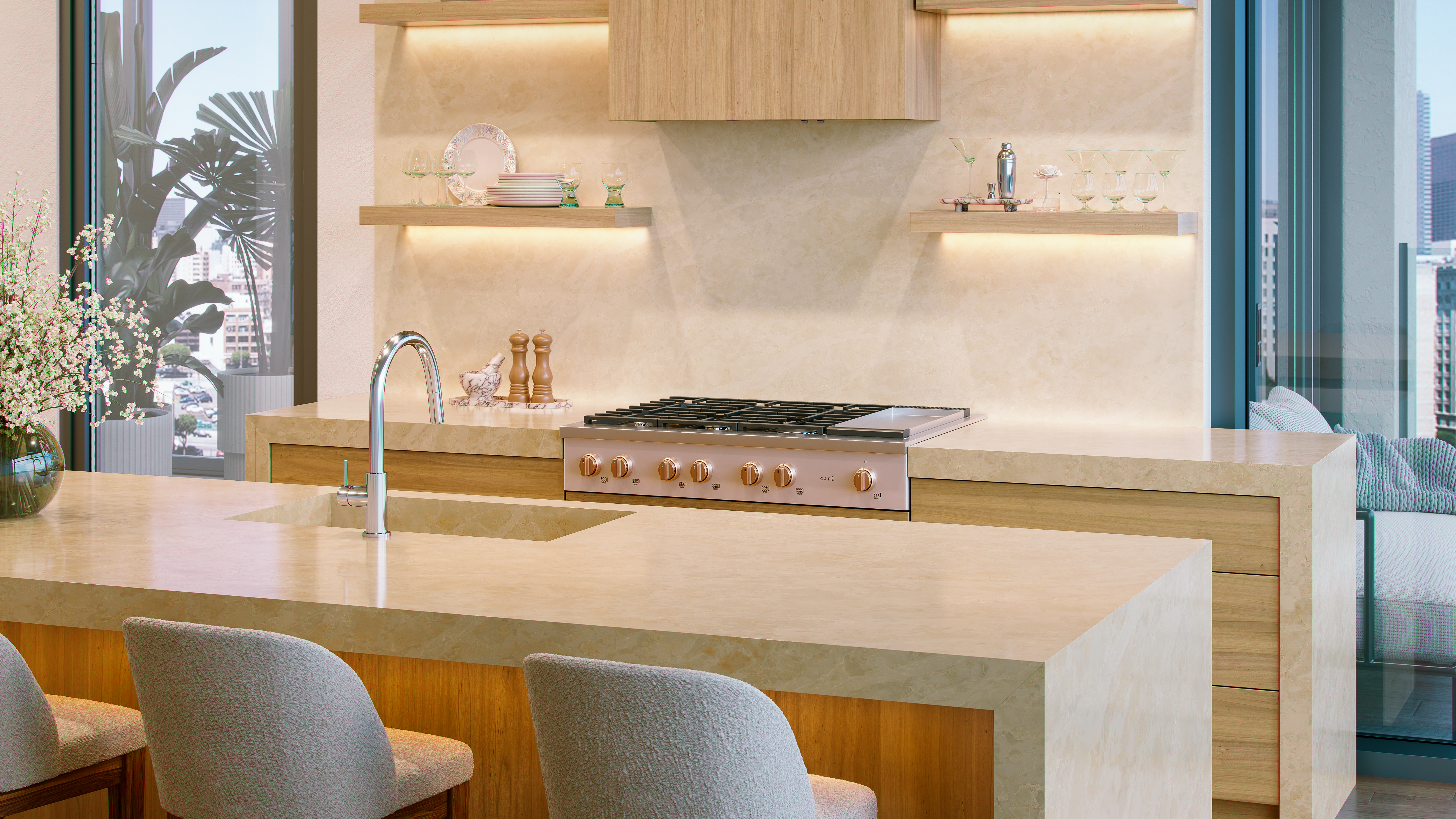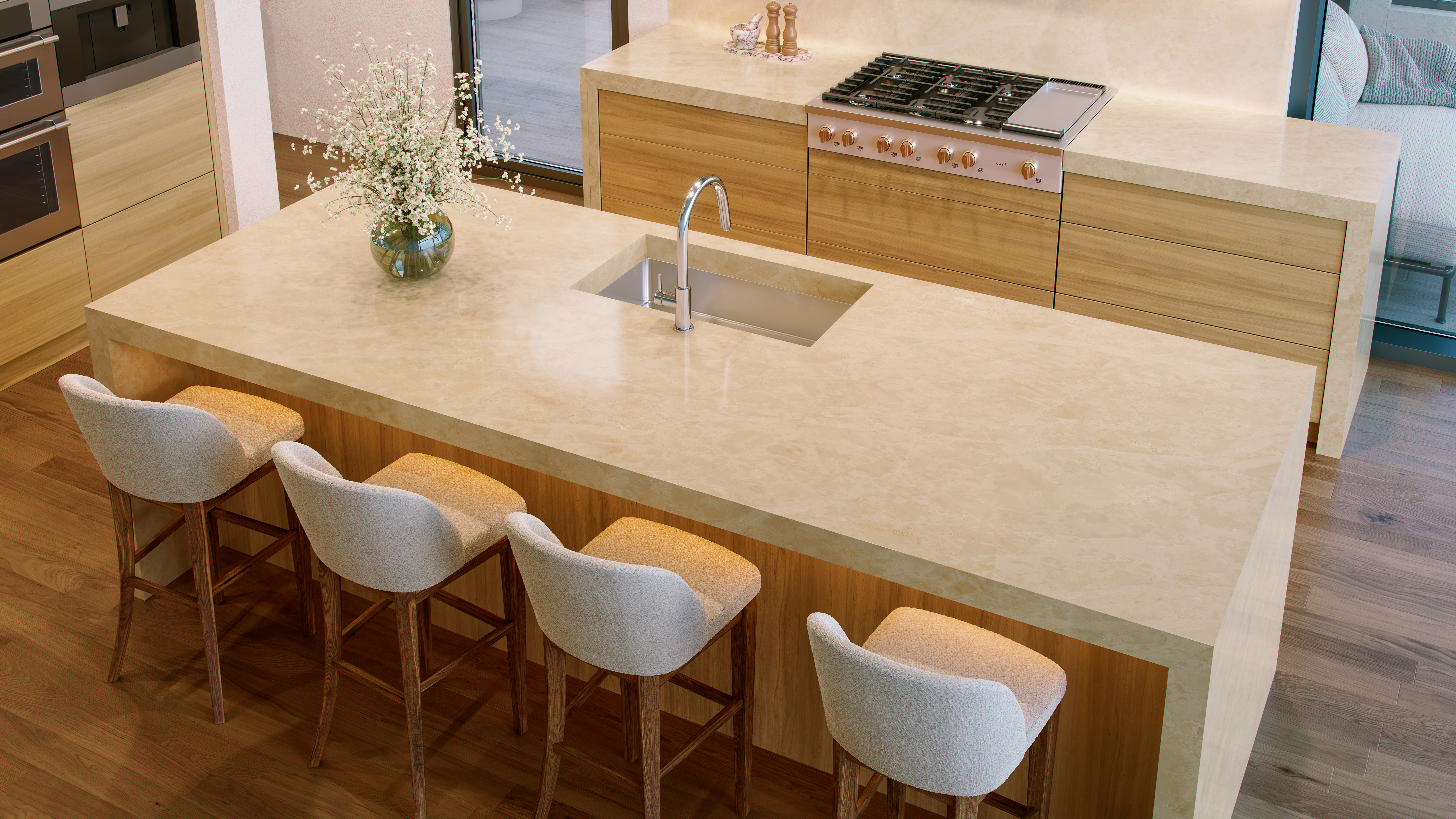 Taj Mahal quartzite-inspired quartz, featuring a soft-leather finish, two-toned beige background with beige and taupe veining