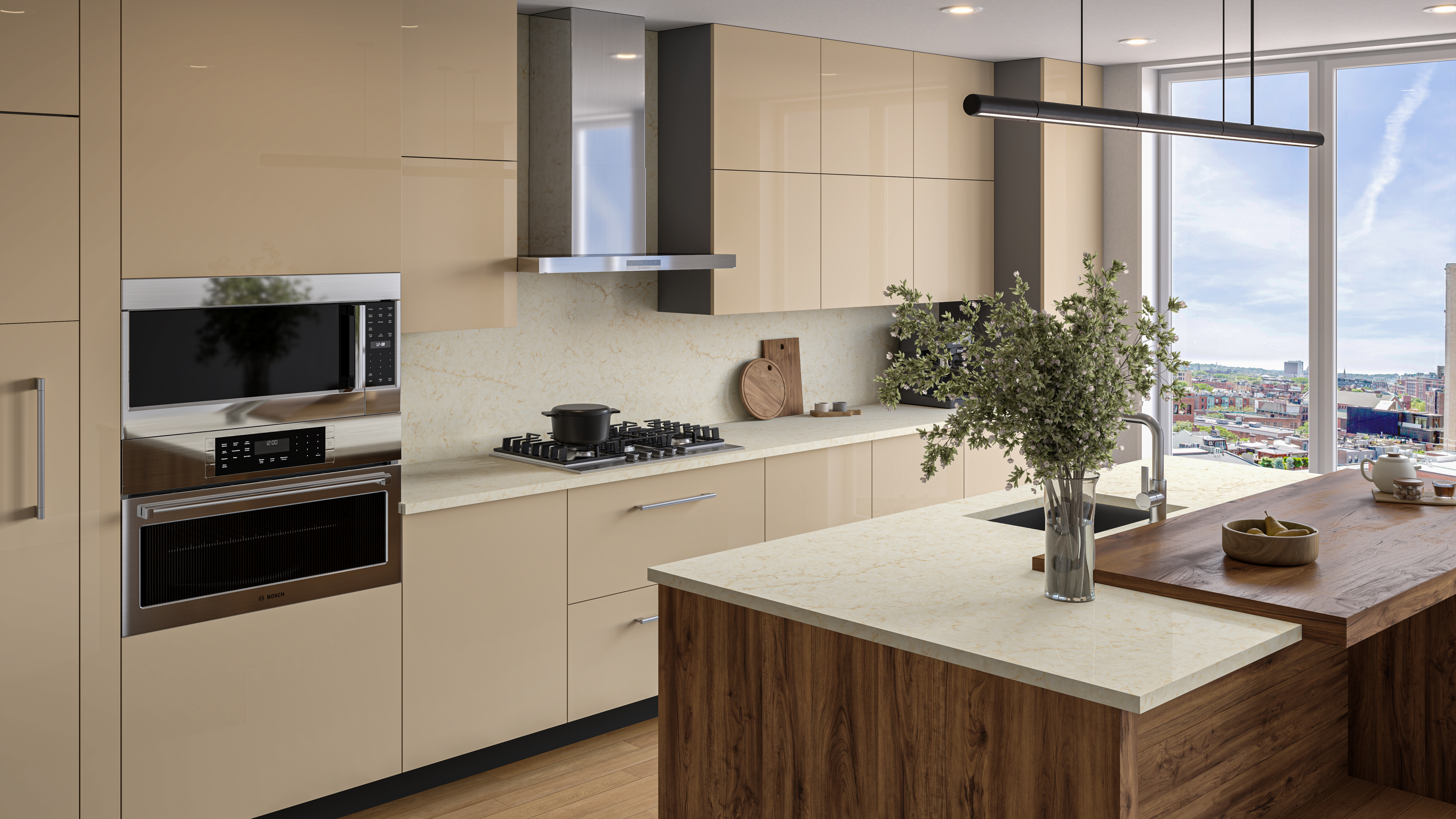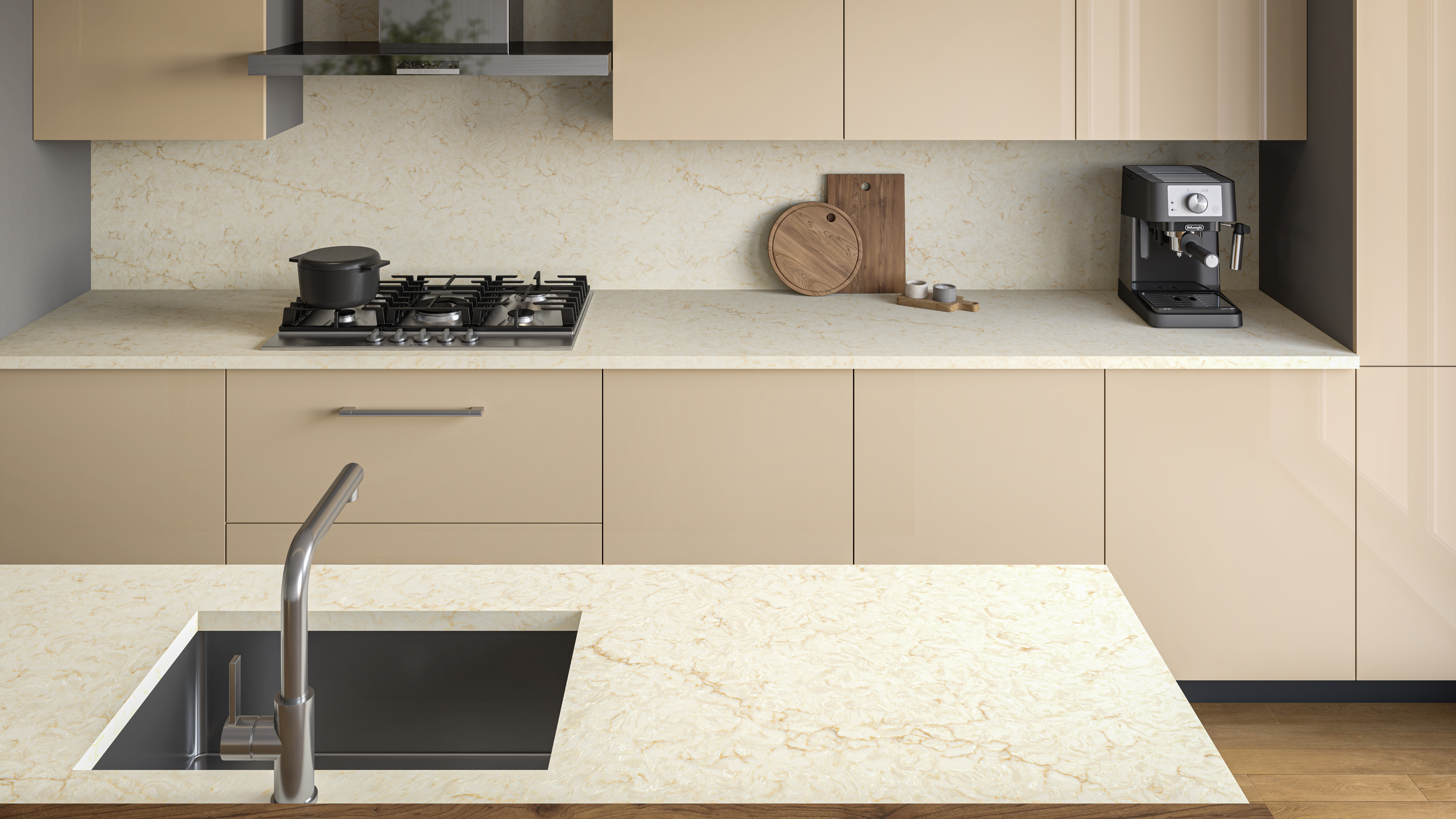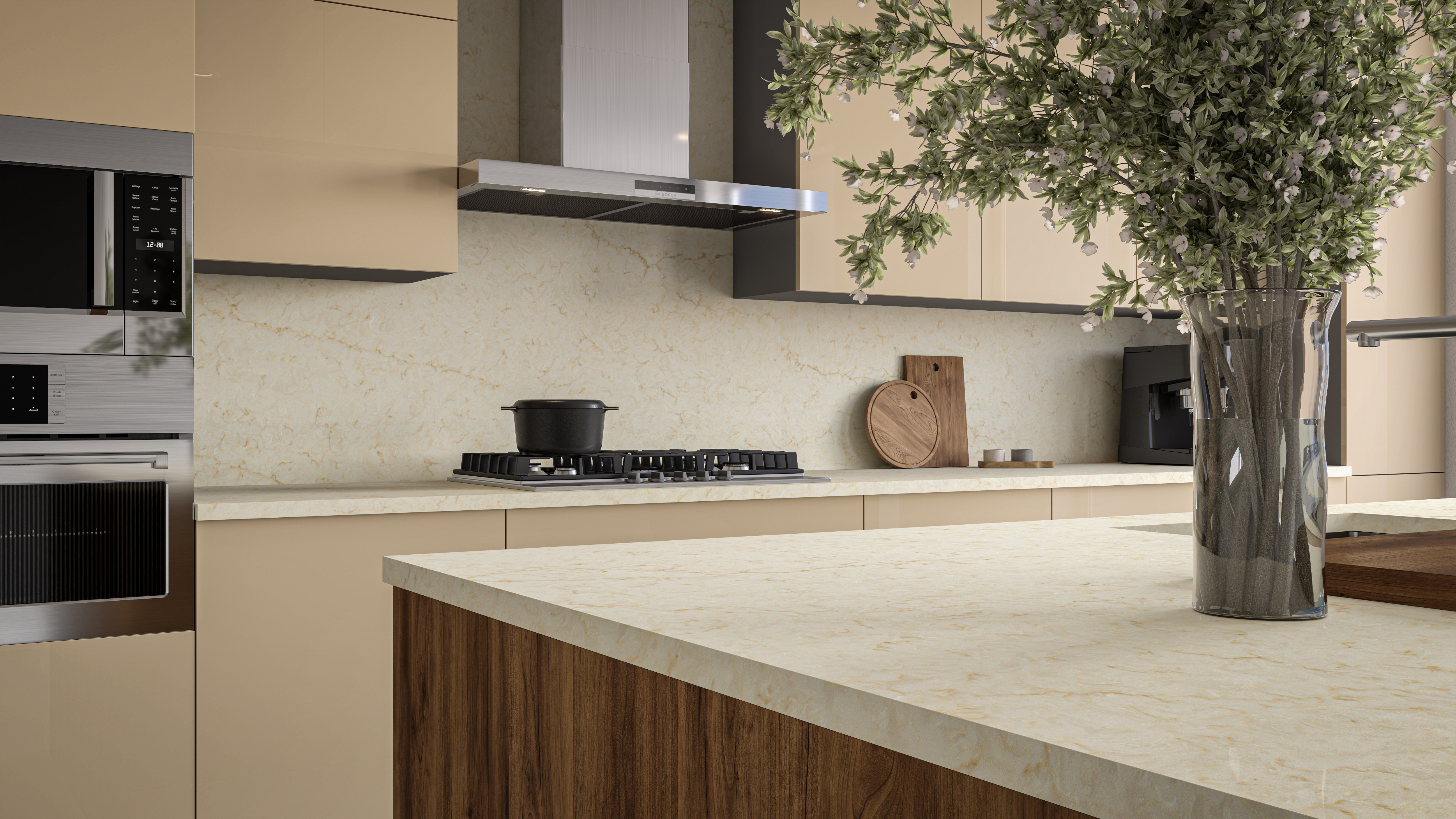 Taj Mahal quartzite-inspired quartz, featuring a beige background with flowing brown veining