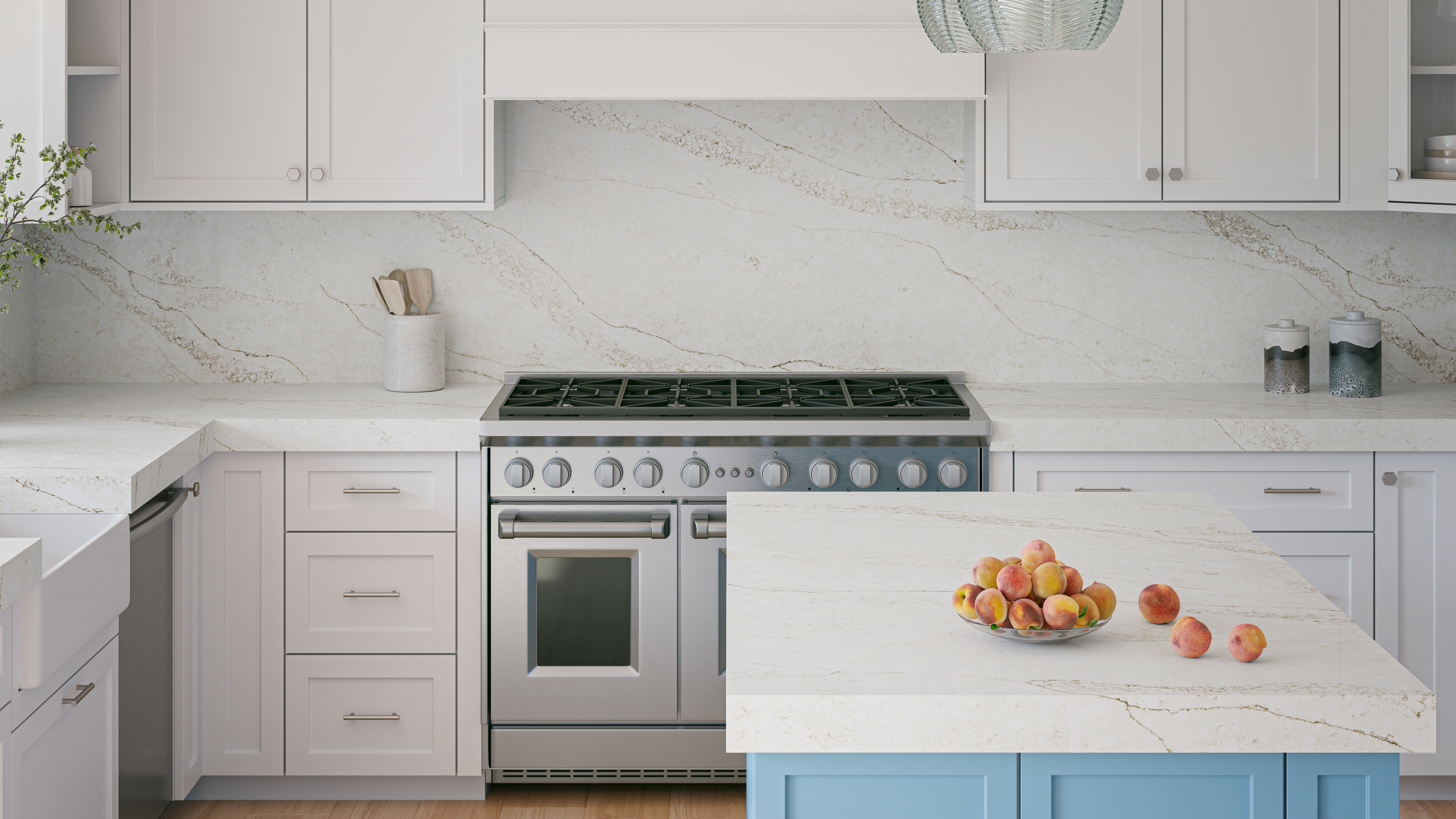 Calacatta marble-inspired quartz, featuring an off-white and grey background with muted gold veining